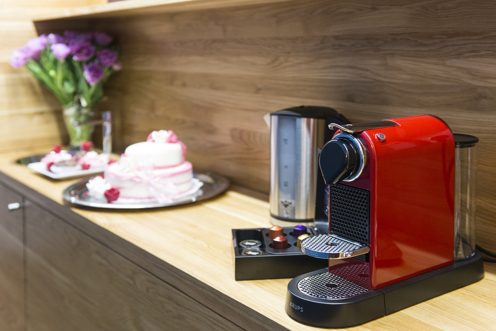 Item83, Link to Larger Image, Red coffee maker and cake on the counter