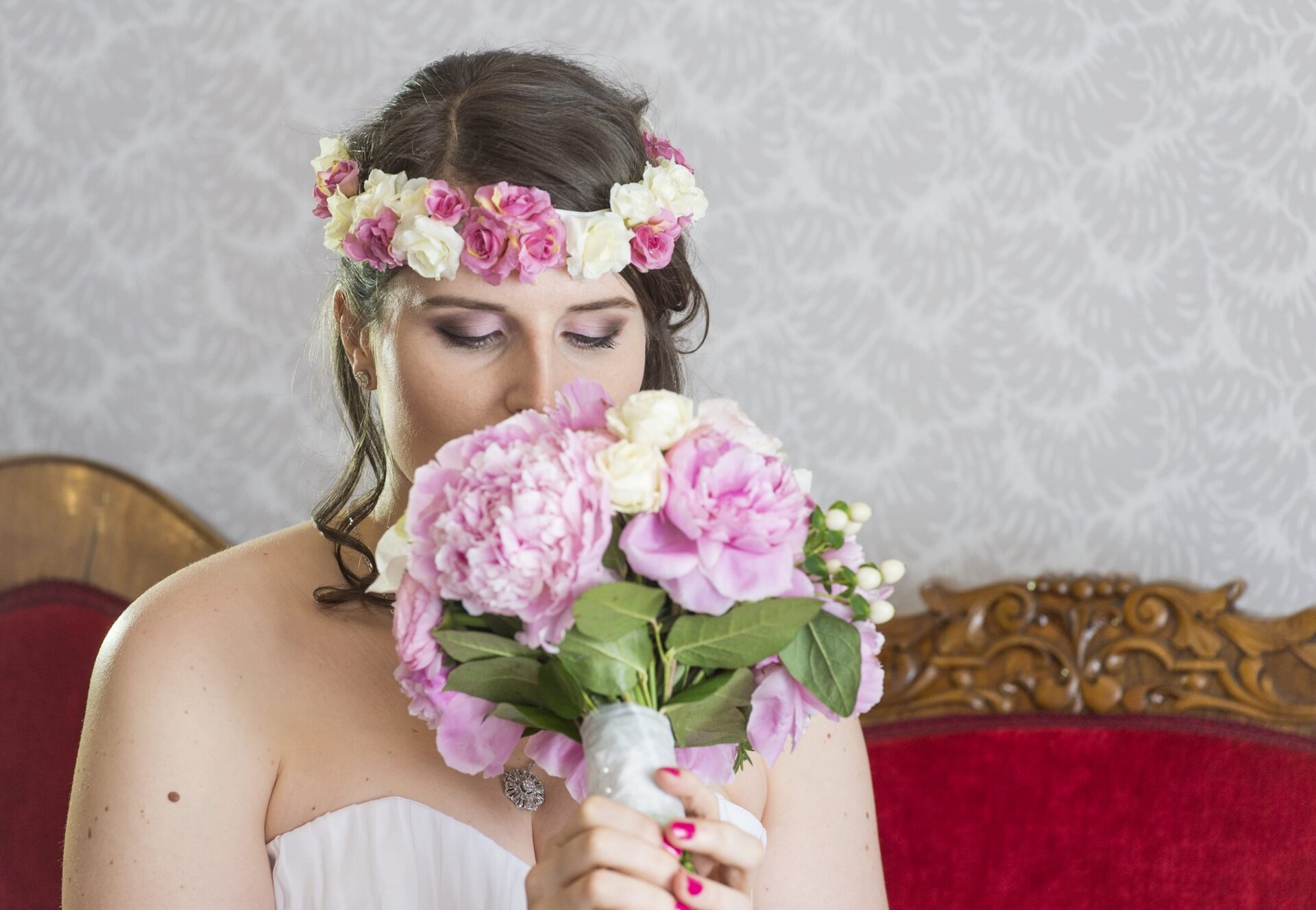 Item94, Link to Larger Image, Woman in white dress sitting on bed with heart of flowers