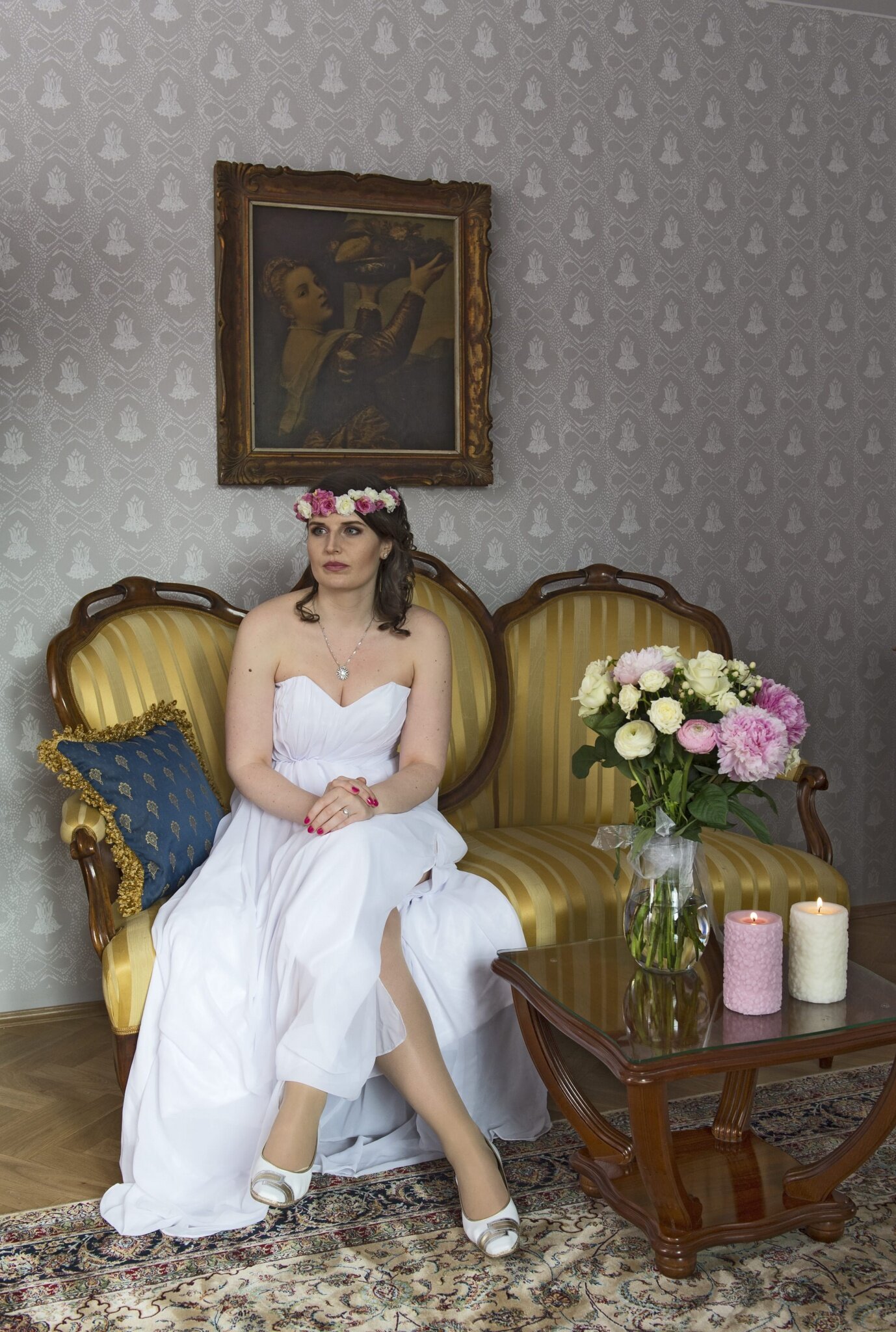 Item97, Link to Larger Image, Woman in white dress sitting on couch