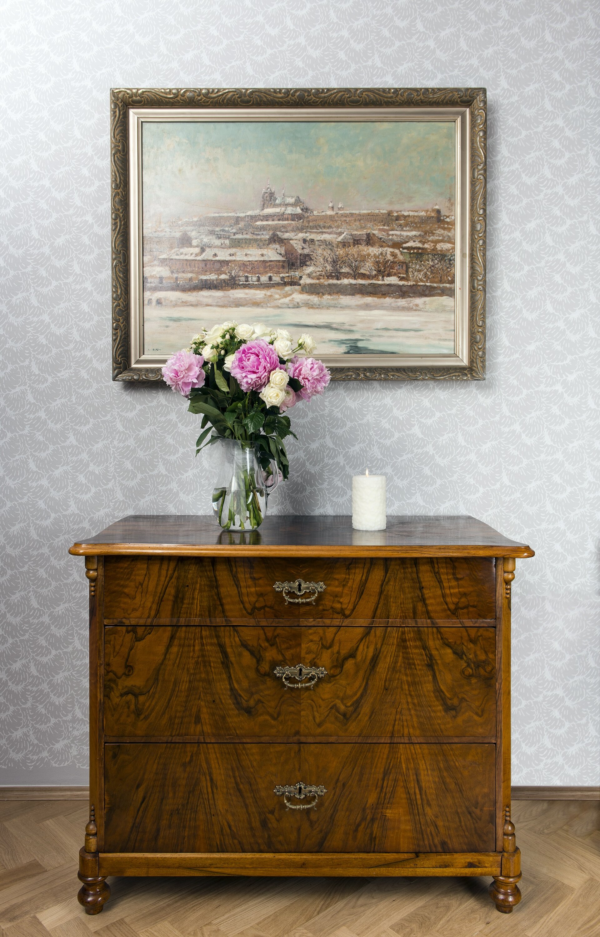 Item46, Link to Larger Image, vase with flowers on a chest of drawers