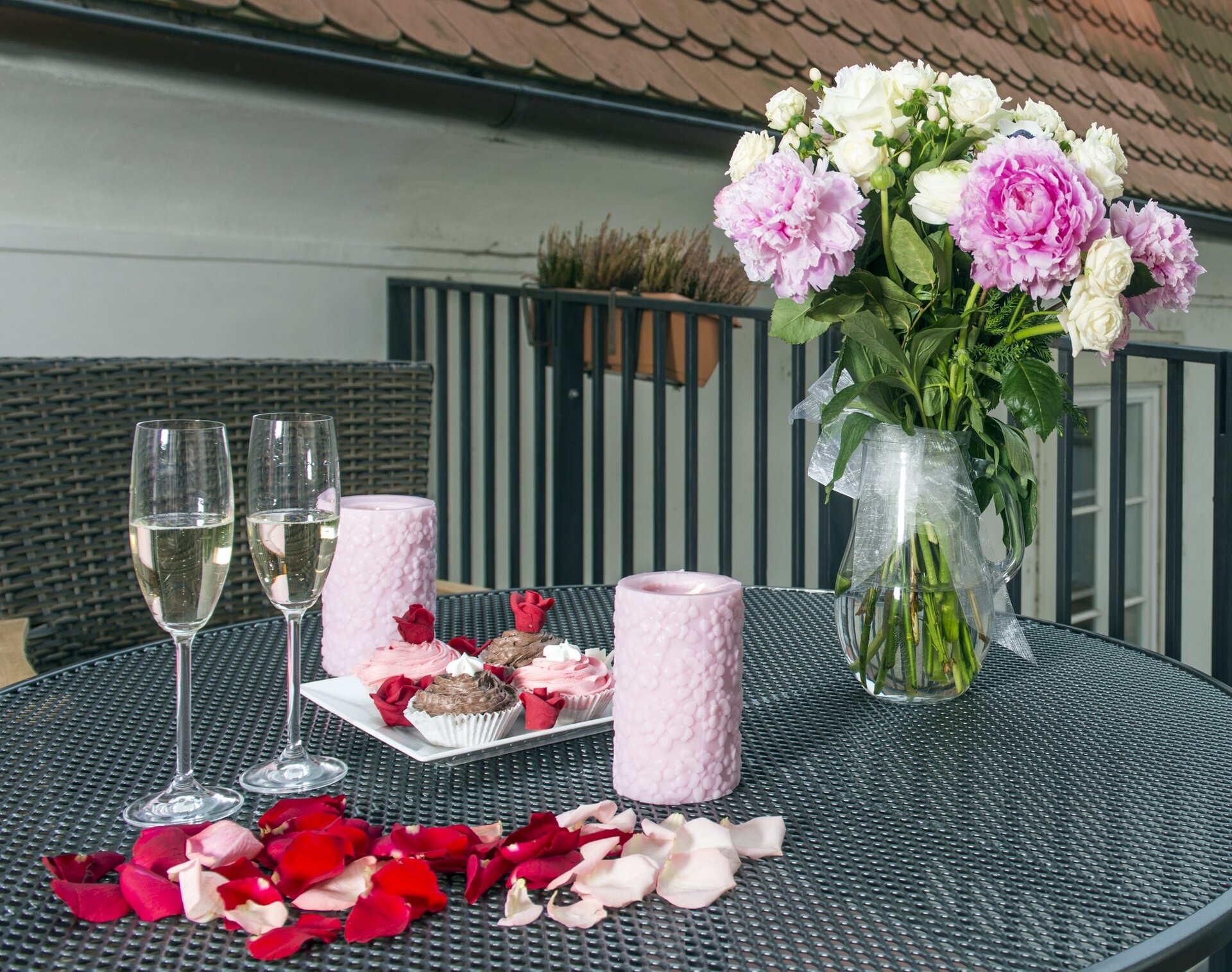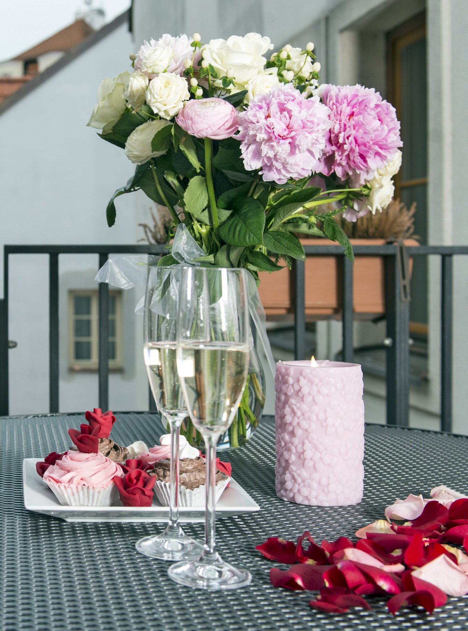 Item33, Link to Larger Image, Tray with cupcakes and champagne glasses with rose petals in the background