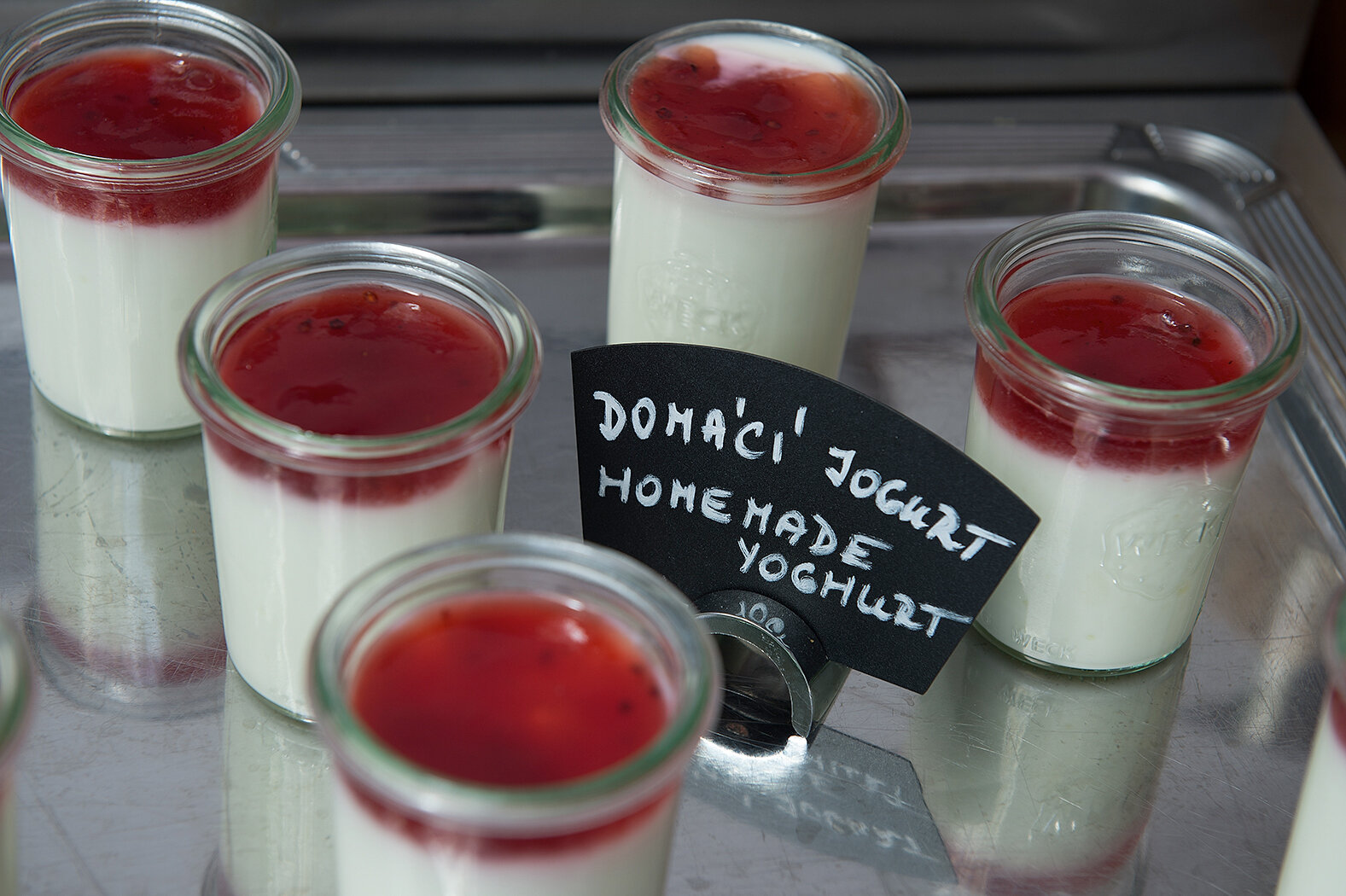 Item24, Link to Larger Image, Group of small glasses of yogurt with black inscription