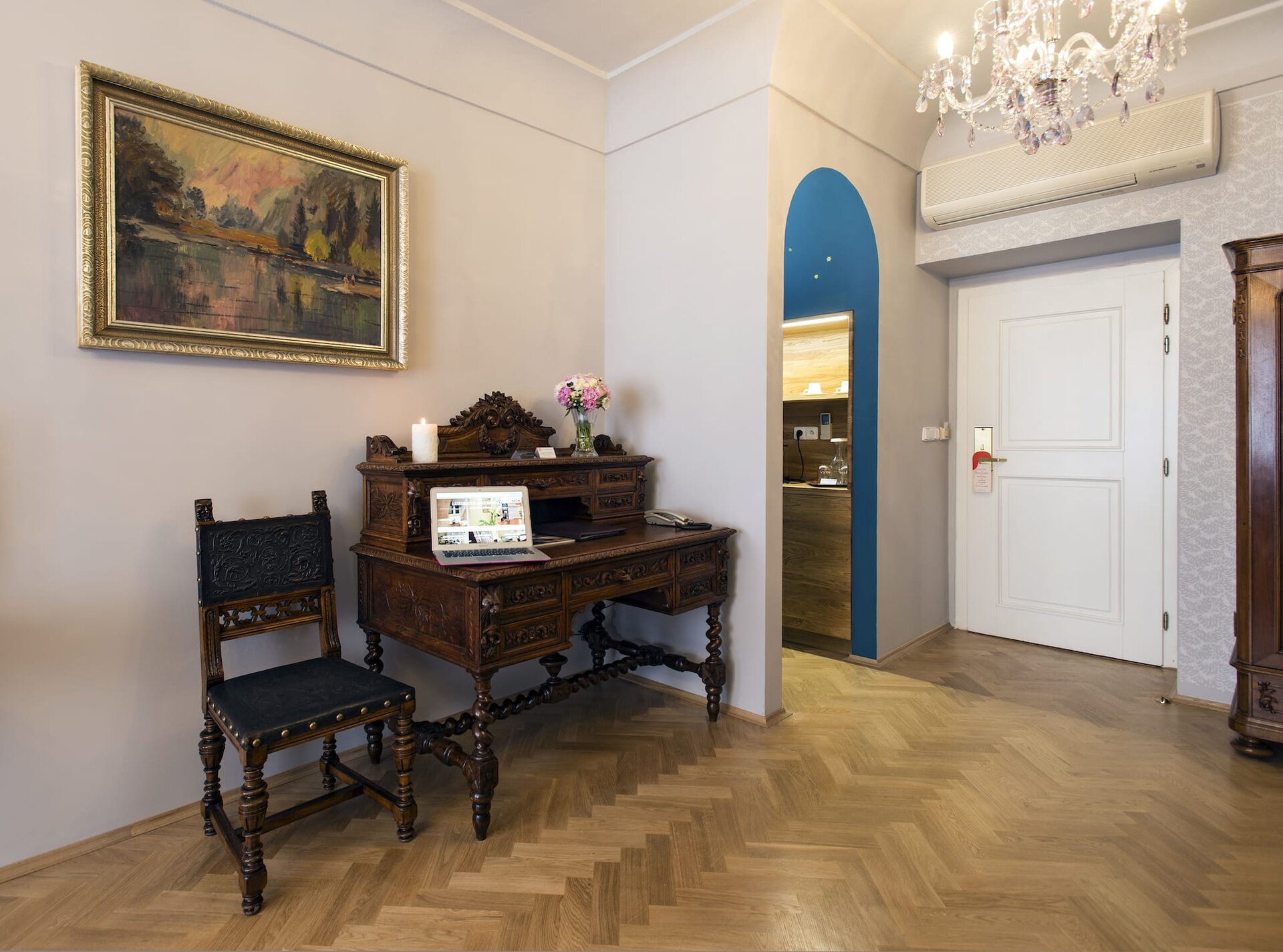 Individually designed by an architect, this remarkably spacious suite showcases grand arched ceilings, large windows, oak parquet floors, and two-tone Biedermeier-style walls with stucco detailing, offering an atmosphere full of character and elegance.